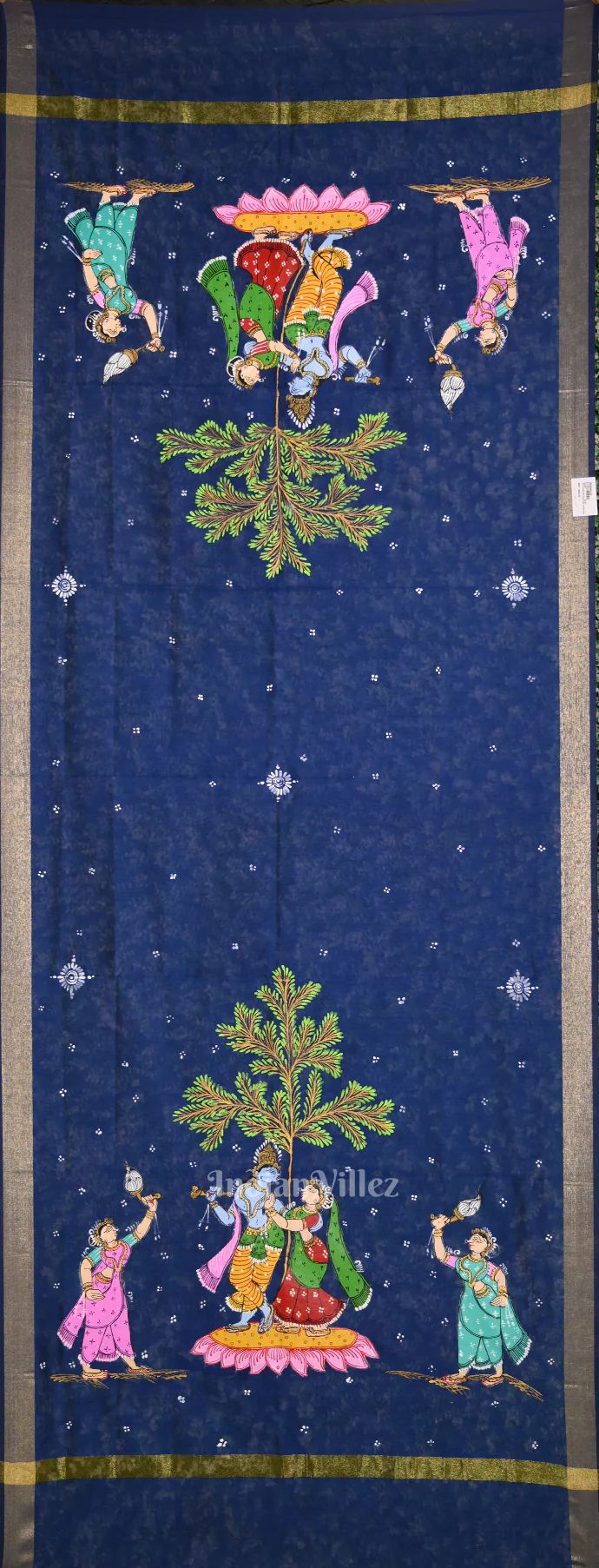 Royal Blue Radha Krishna Hand-Painted Pattachitra Chanderi Dupatta