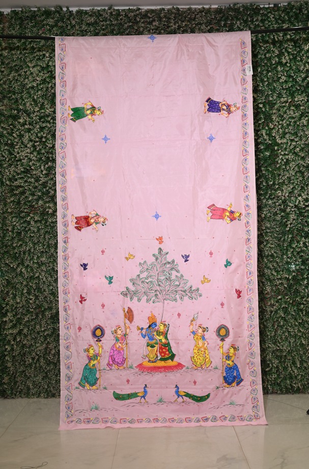 Baby Pink Radha Krishna Raas Leela Hand-Painted Pattachitra Saree-(Mulberry Silk)