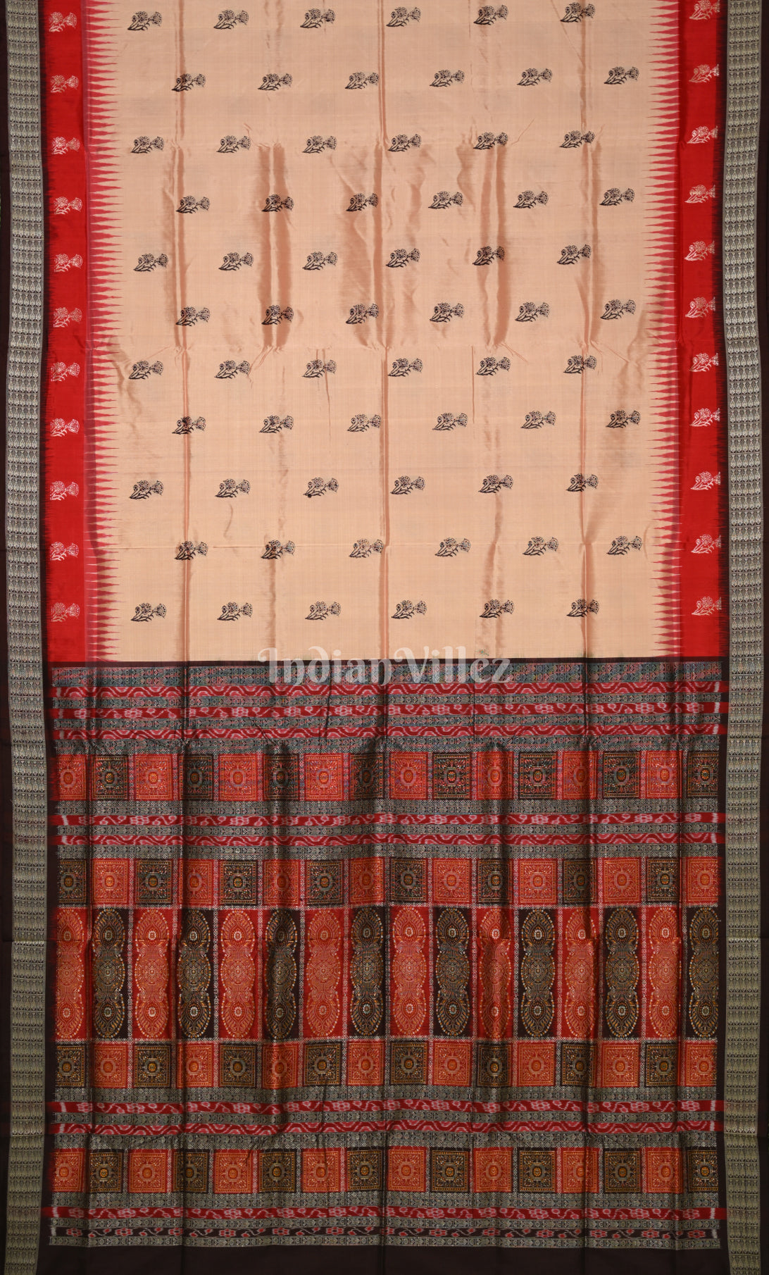 Beige Red Odisha Ikat Bomkai Sambalpuri Silk Saree