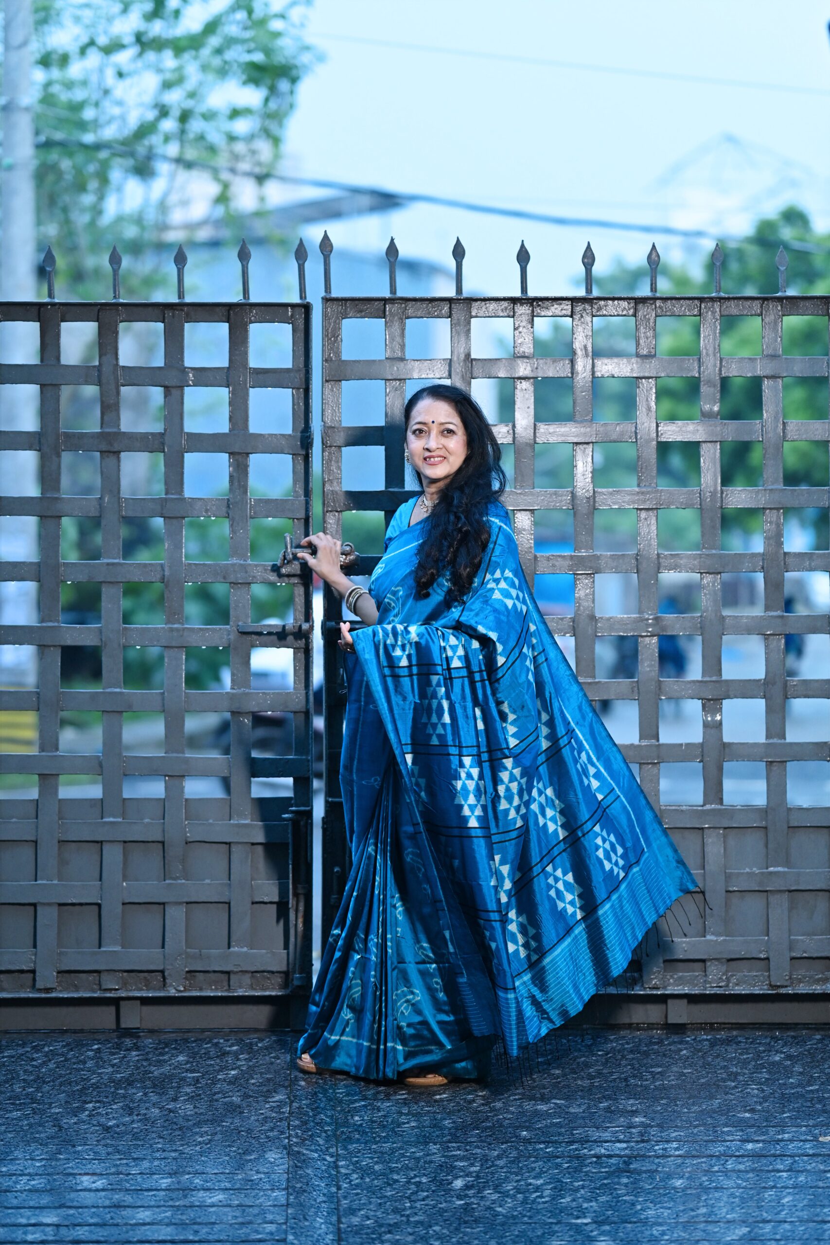 Midnight Blue Floral Contemporary Designer Ikat Silk Saree