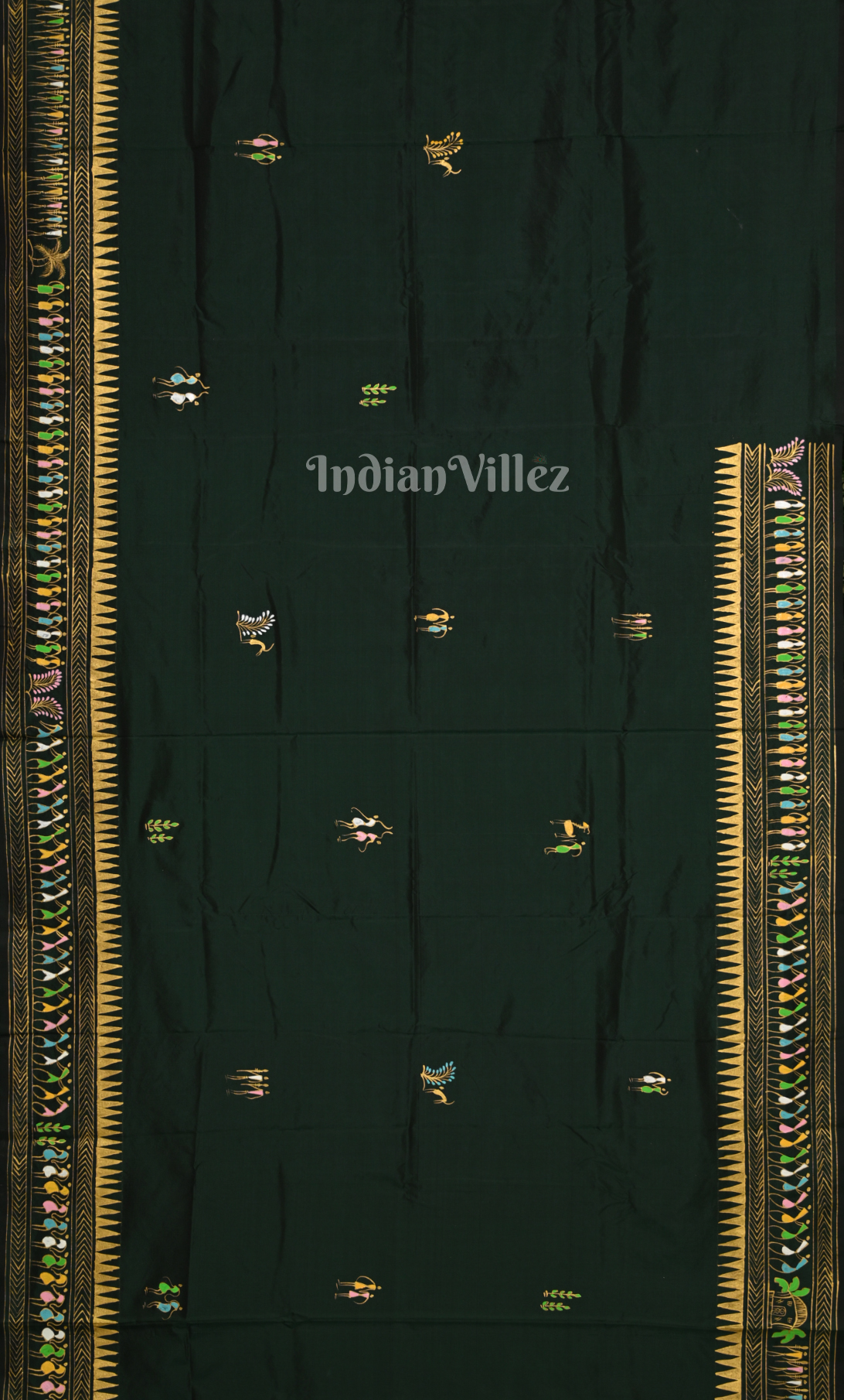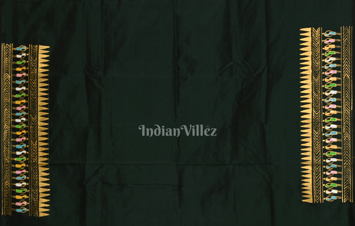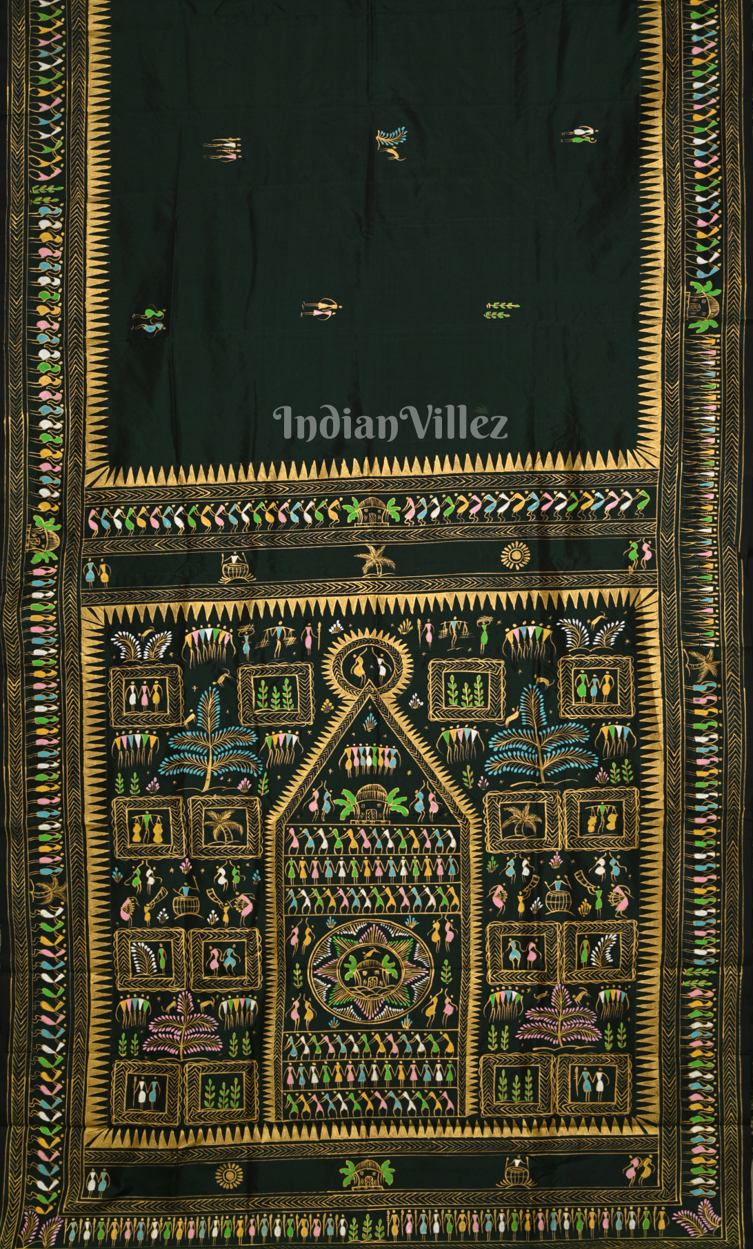 Bottle Green Saura Tribal Art Hand-Painted Pattachitra Saree-(Mulberry Silk)