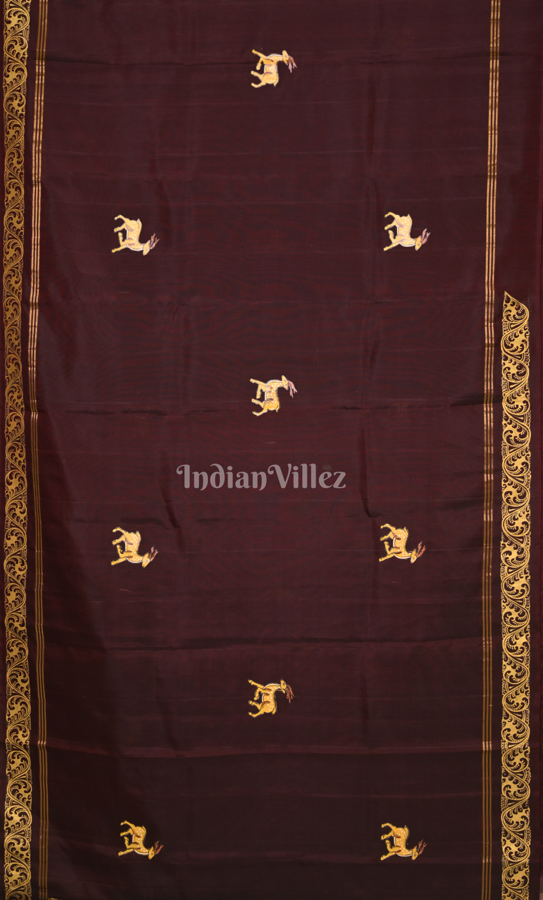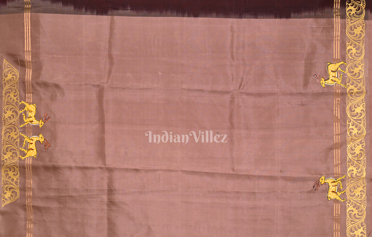 Coffee Cream Ramayan Theme Hand-Painted Pattachitra Saree-(Kanjivaram Silk)
