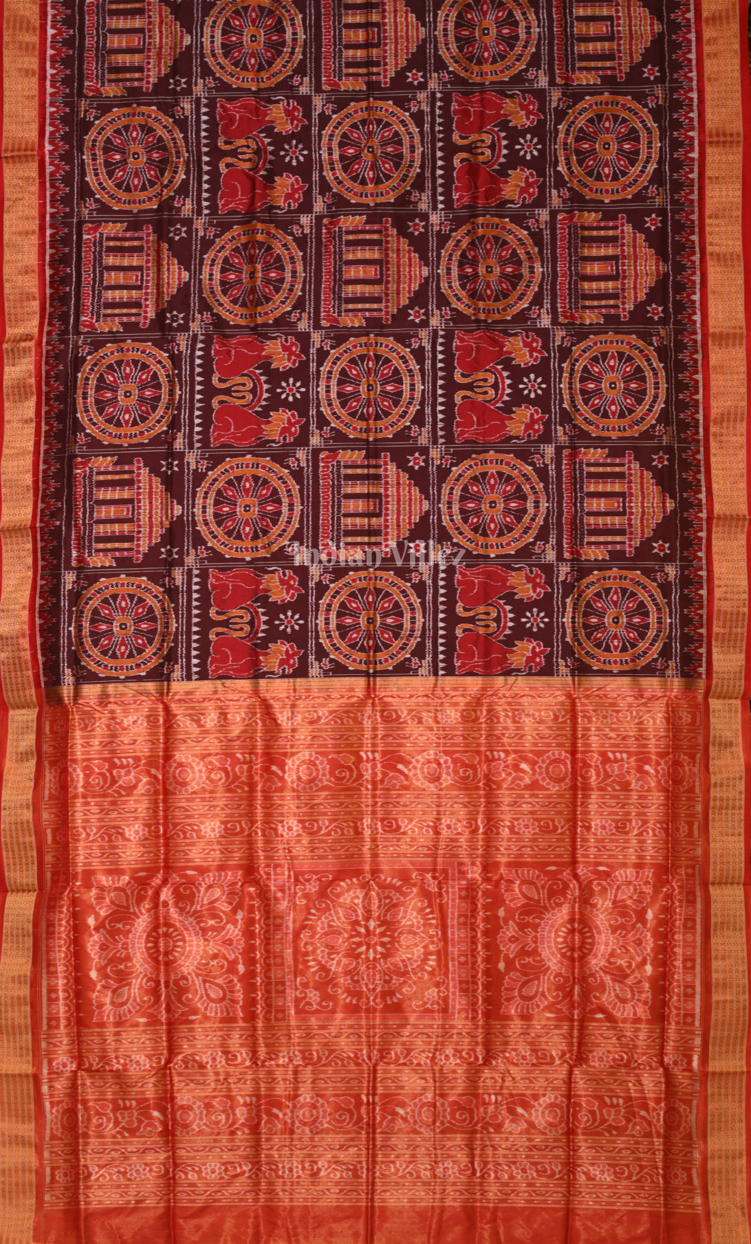 Coffee Red Konark temple & Wheel Design Half Tissue Sambalpuri Silk Saree