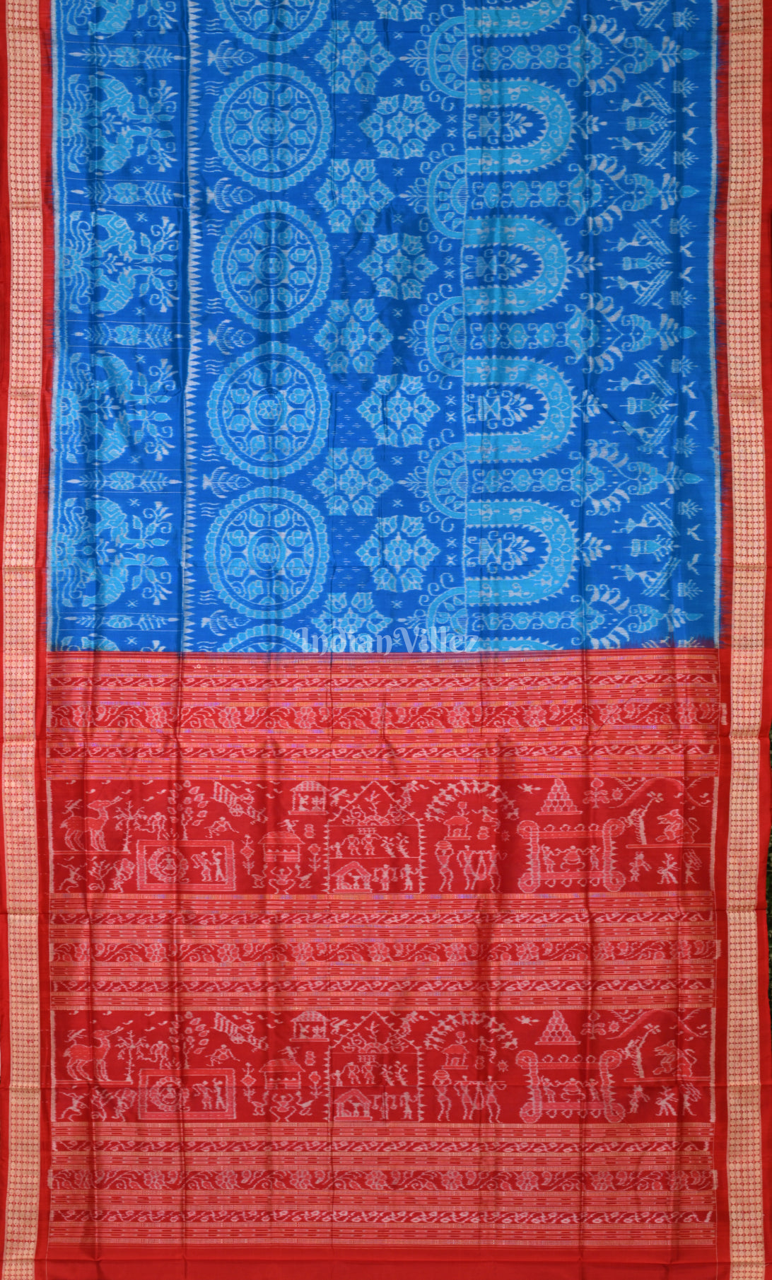 Exquiste Blue Red Tribal village life Design Odisha Ikat Sambalpuri Silk Saree