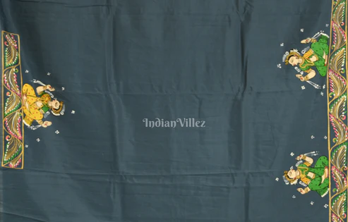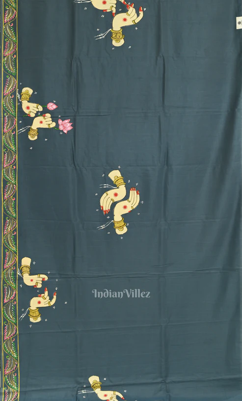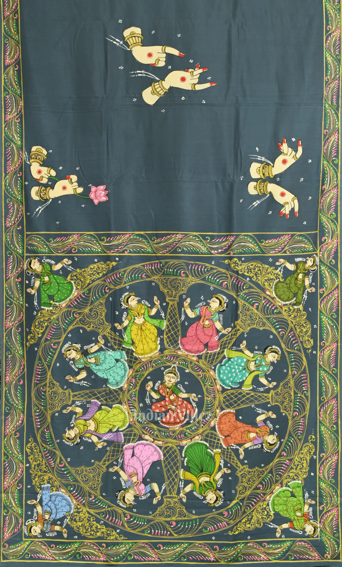 Grey Nartaki Mudra Hand-Painted Pattachitra Silk Saree-(Khadi Silk)