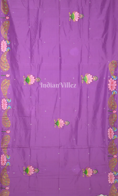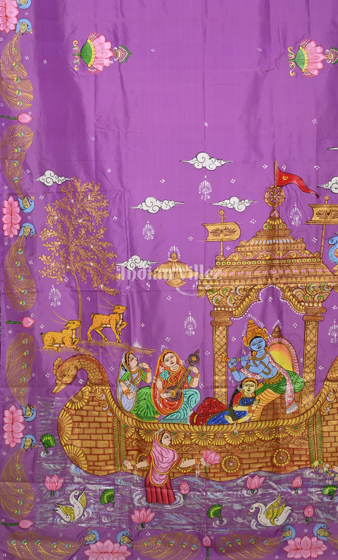 Lavender Nabakeli Boita Hand-Painted Pattachitra Saree-(Mulberry Silk)