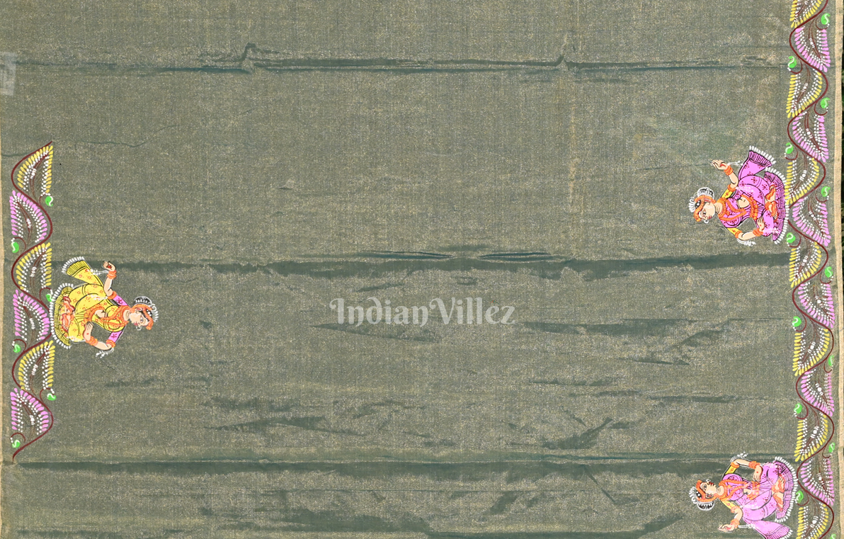 Parrot Green Dual Tone Tribal Themed Hand-Painted Pattachitra Saree-(Mulberry Silk)