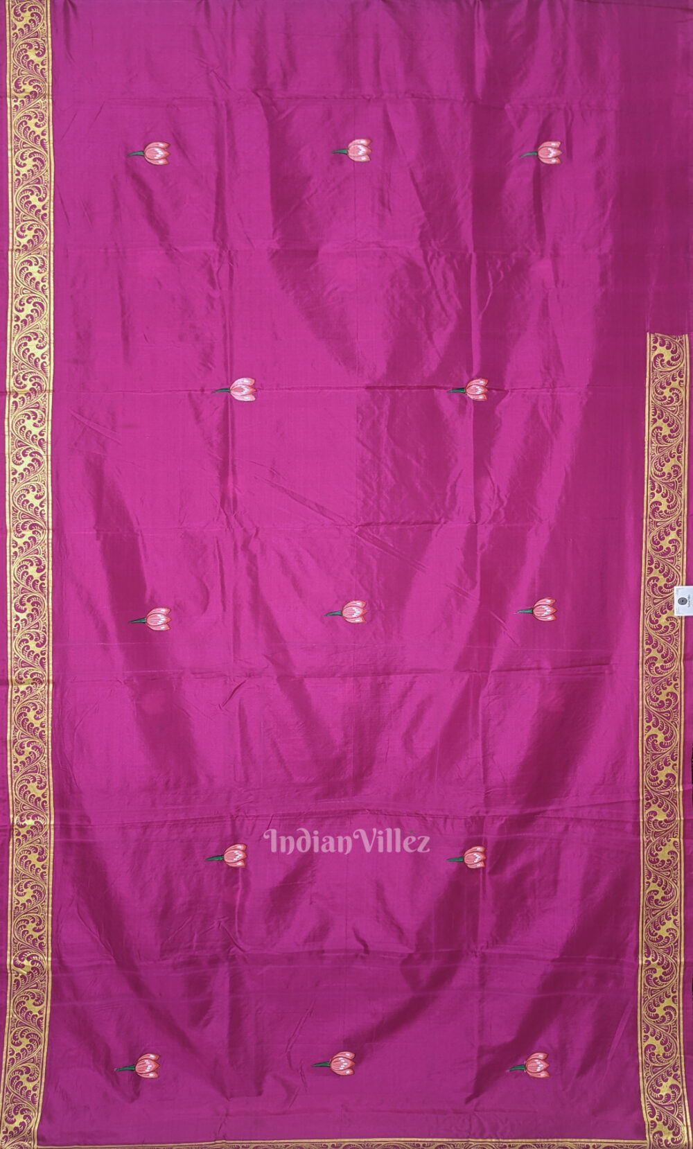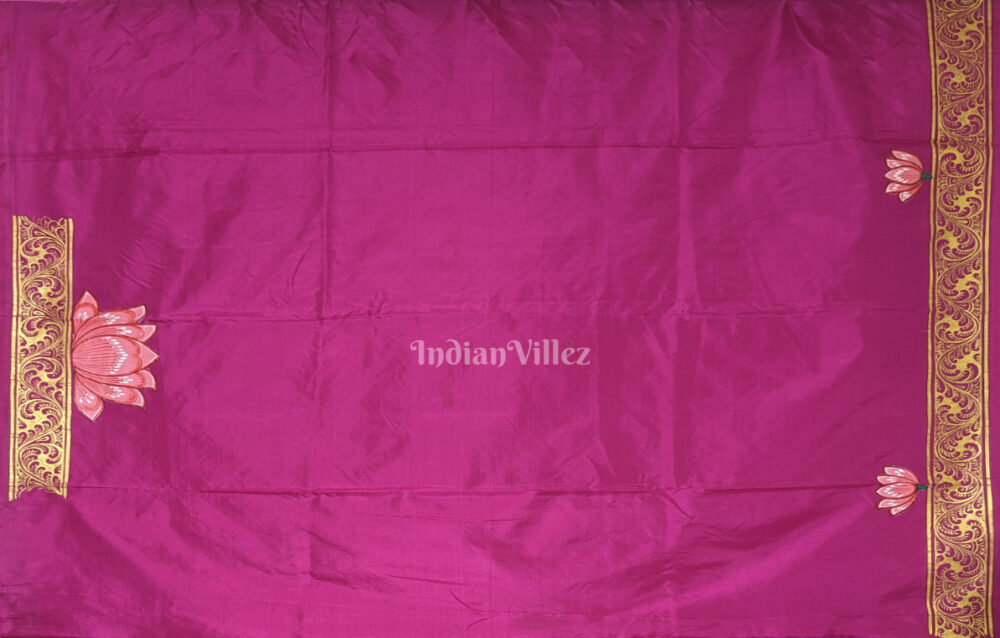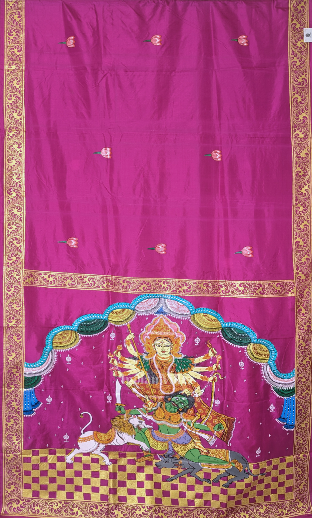 Magenta Pink Durga Puja Theme Hand-Painted Pattachitra Saree-(Mulberry Silk)