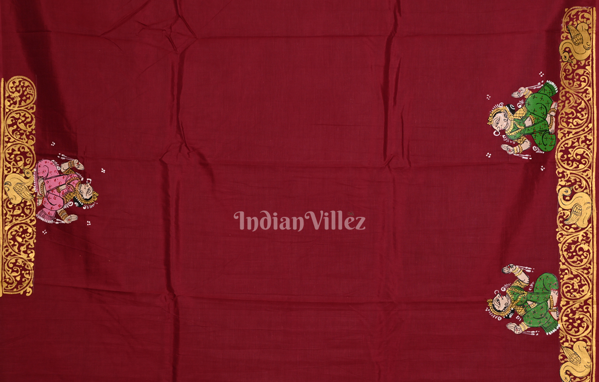 Maroon Ramayana Theme Hand-Painted Pattachitra Saree-(Khadi Silk)