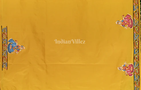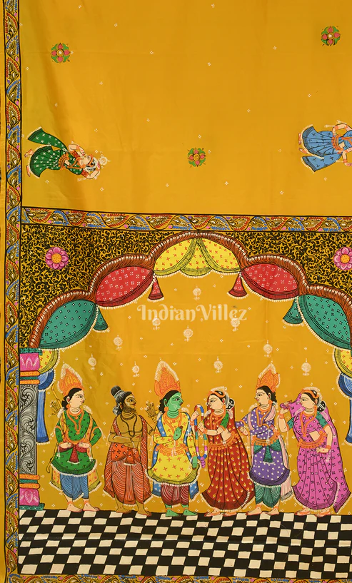 Mustard Yellow Ramayana Theme Hand-Painted Pattachitra Saree-(Mulberry Silk)