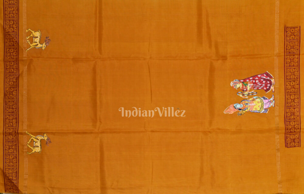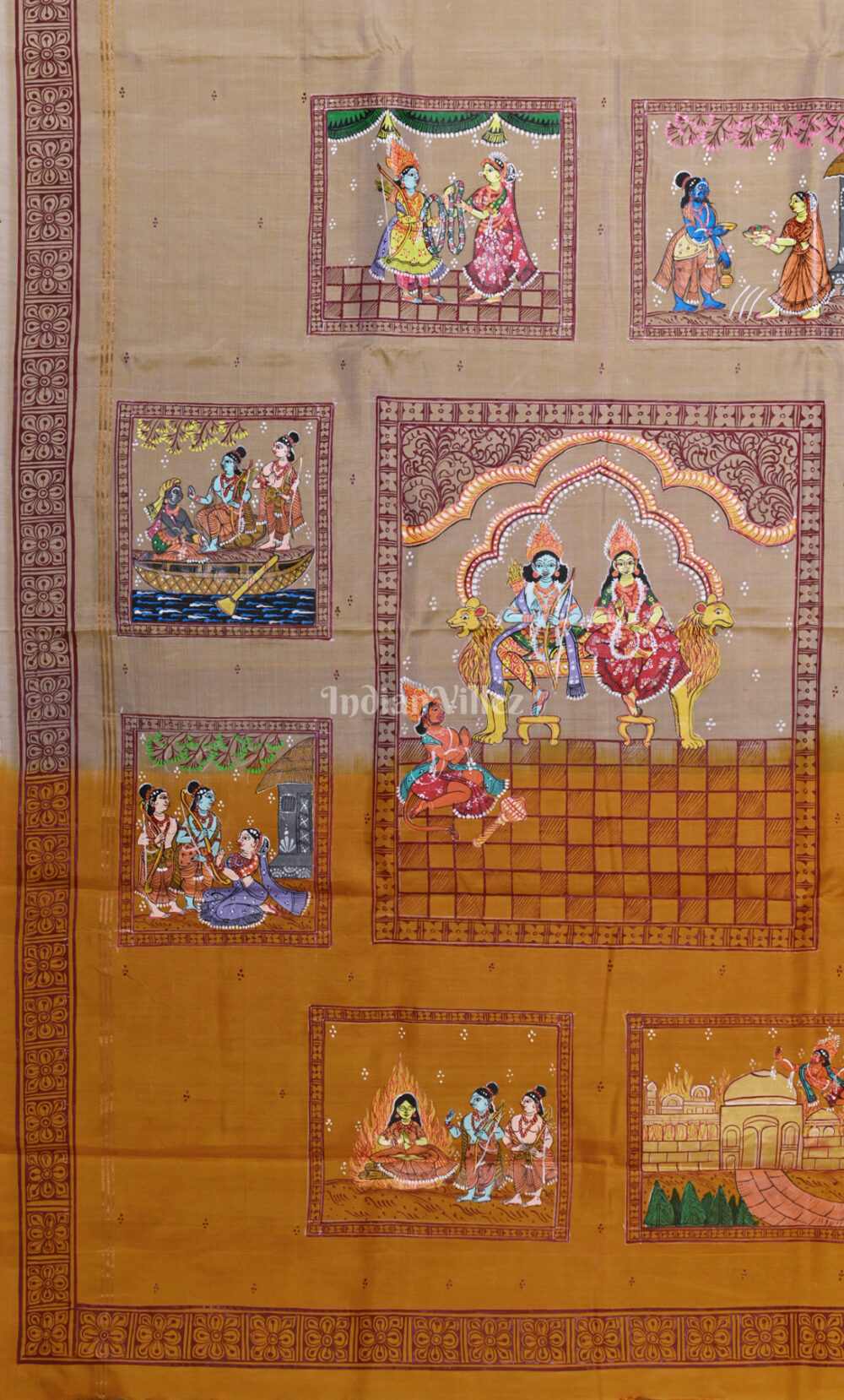 Pastel Beige Yellow Ramayan Theme Hand-Painted Pattachitra Saree-(Kanjivaram Silk)