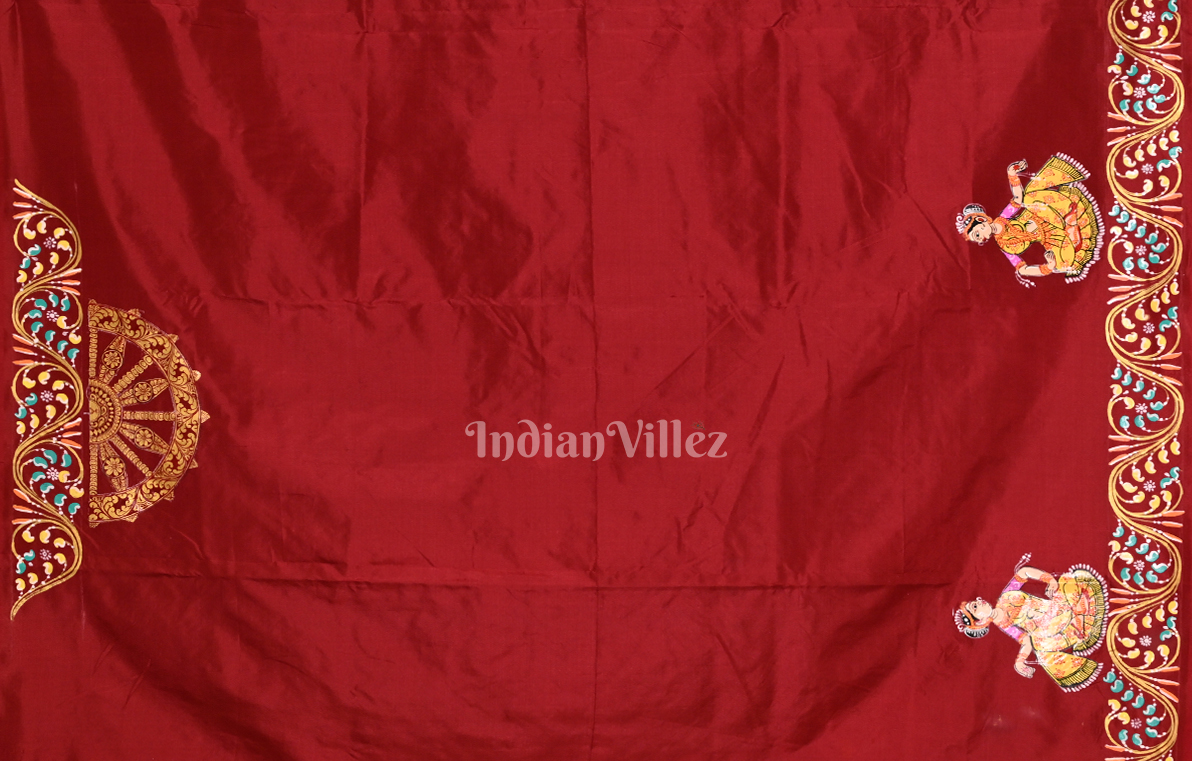 Pista Green Red Dual Tone Nartaki Konark Temple Hand-Painted Pattachitra Saree-(Mulberry Silk)