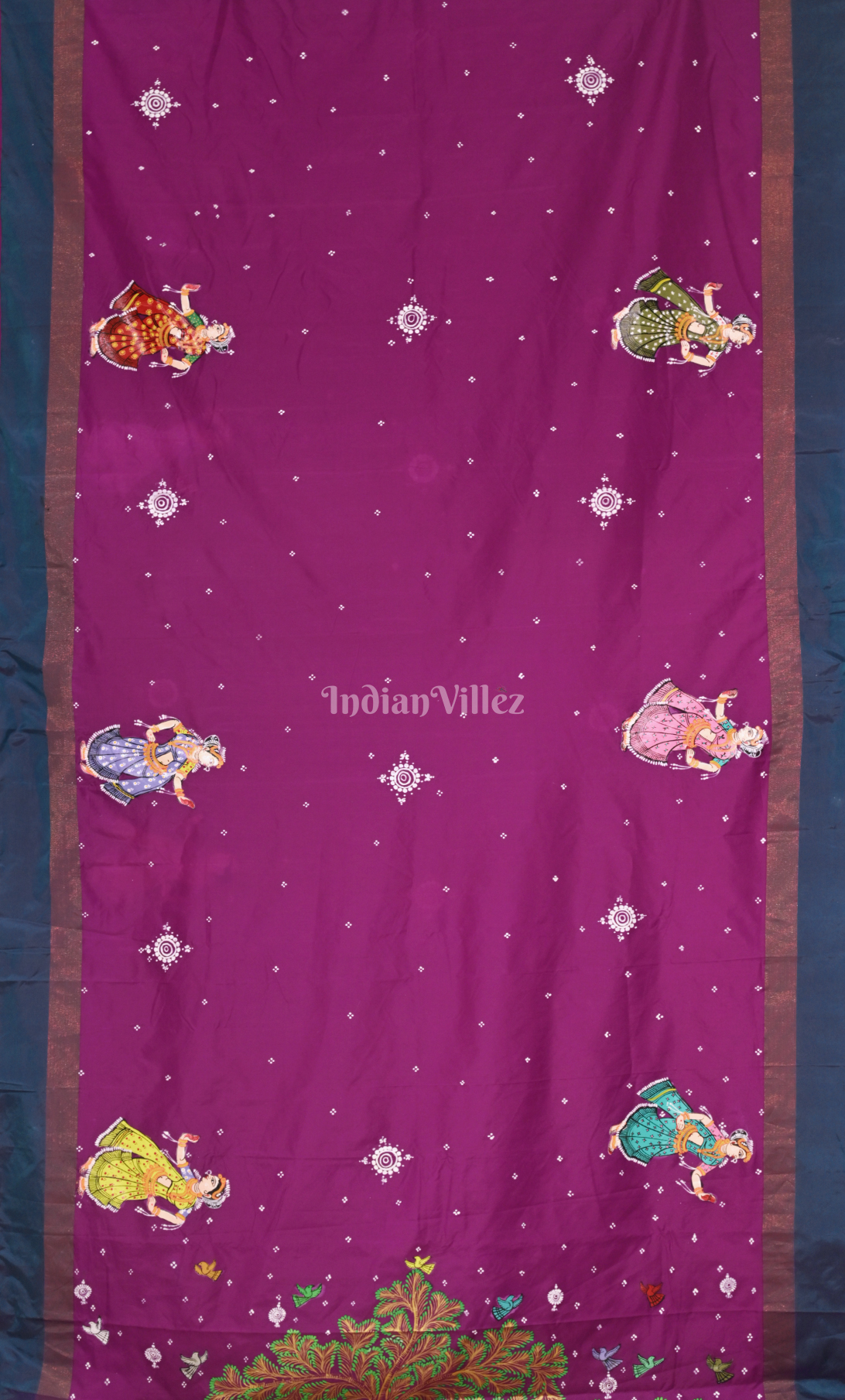 Purple Blue Raasleela Hand-Painted Pattachitra Saree-(South Silk)