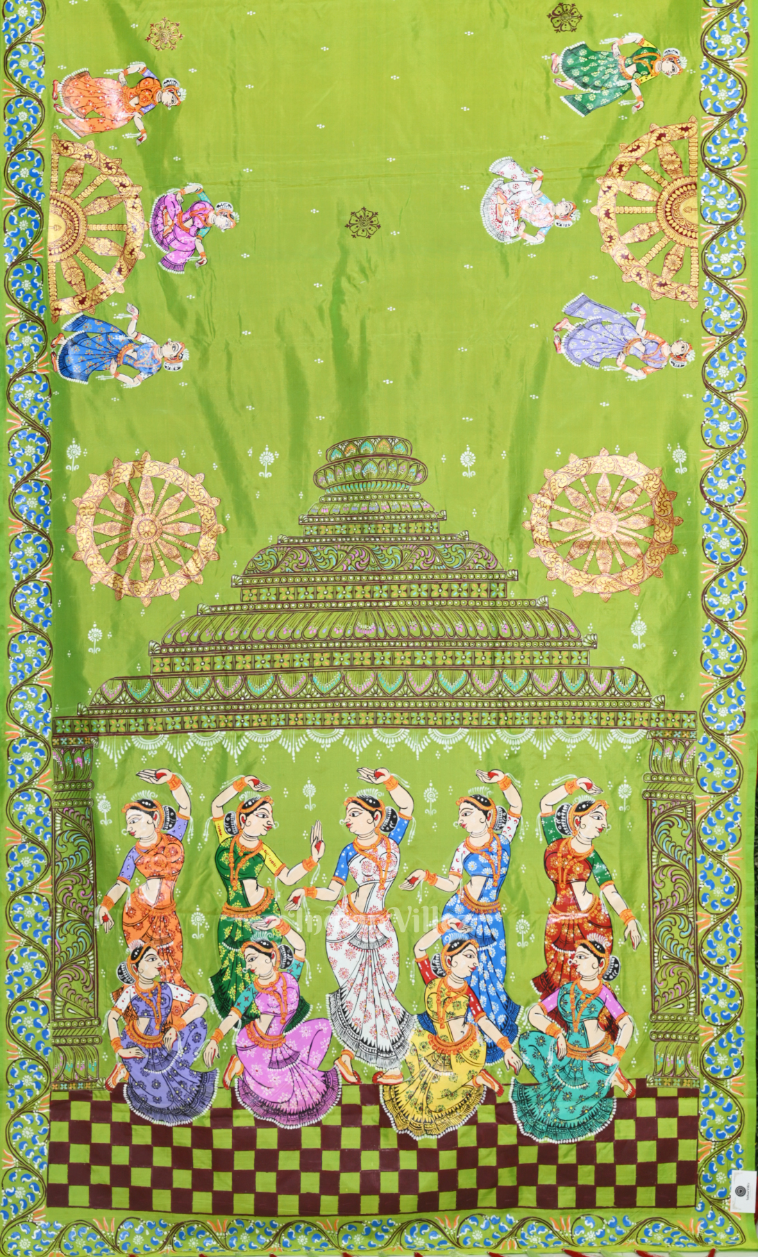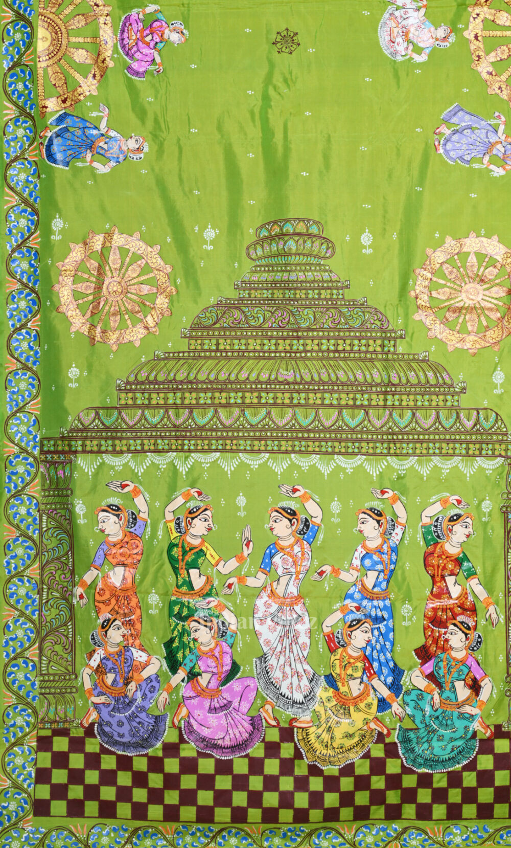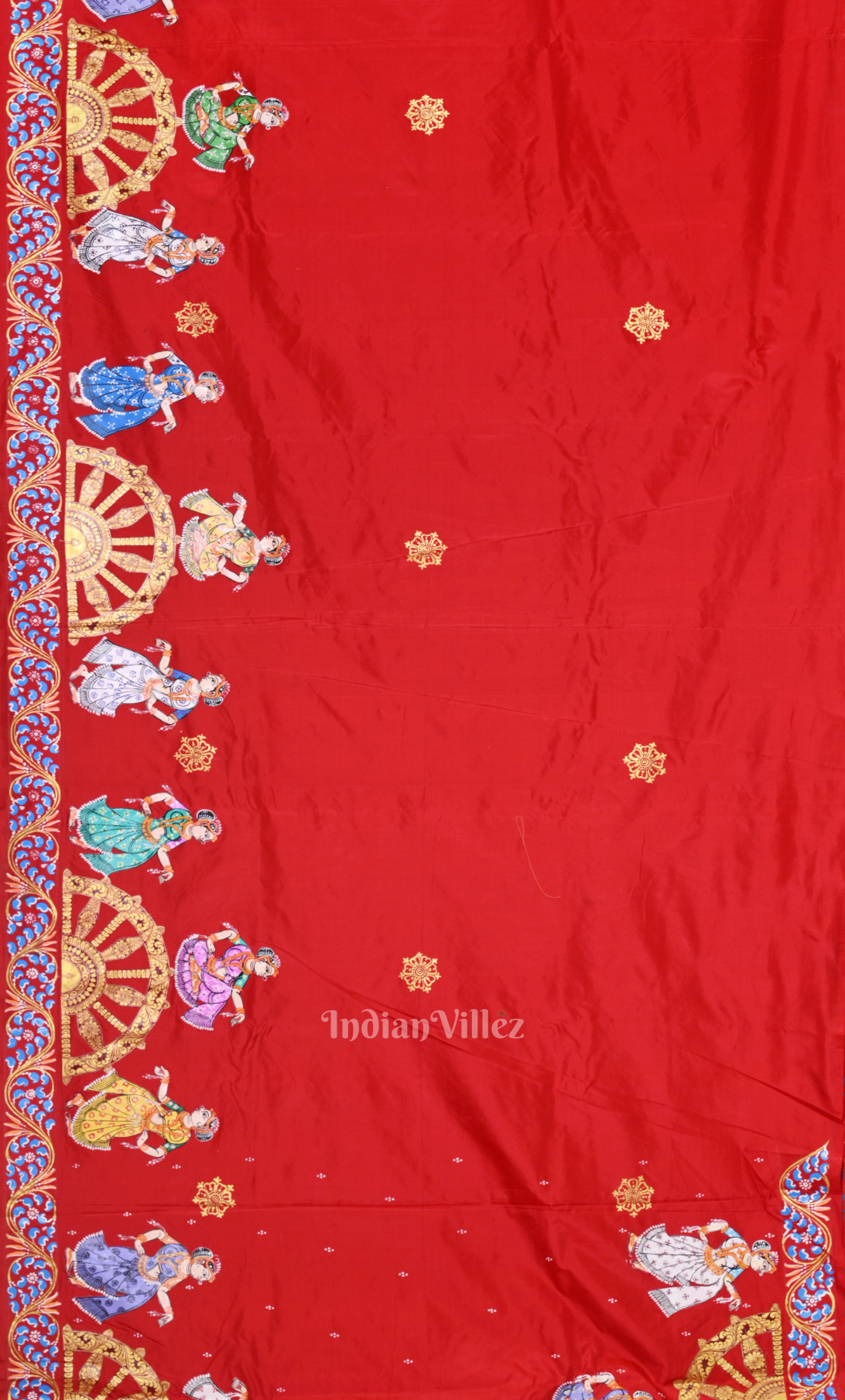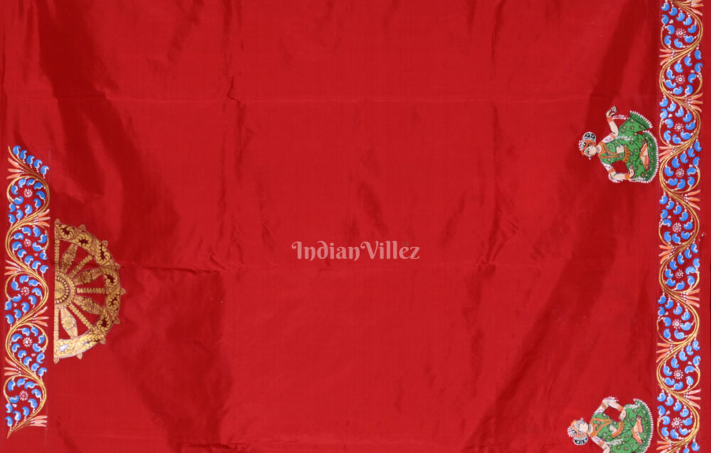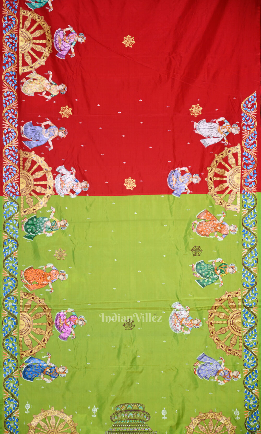 Red Green Nartaki Konark Temple Hand-Painted Pattachitra Saree-(Mulberry Silk)