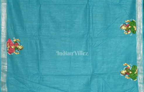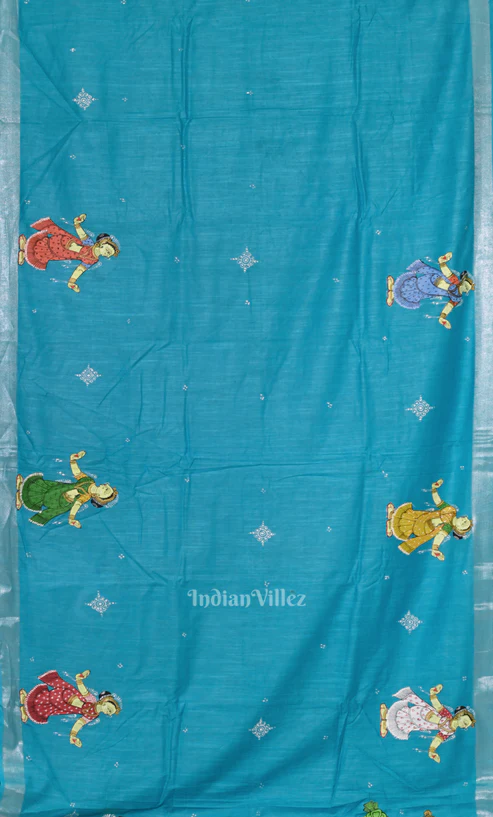 Sky Blue Doli Barat Theme Hand-Painted Pattachitra Saree-(Linen)