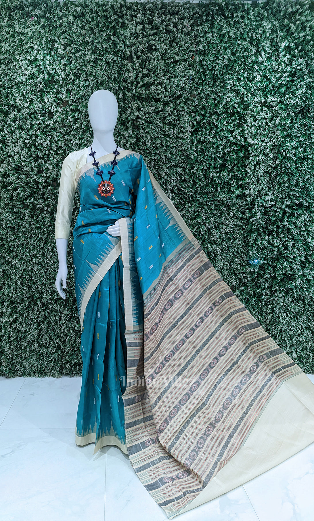 Teal Blue Sambalpuri Phoda Kumbha Tussar Silk Saree with Sarabandha Anchal