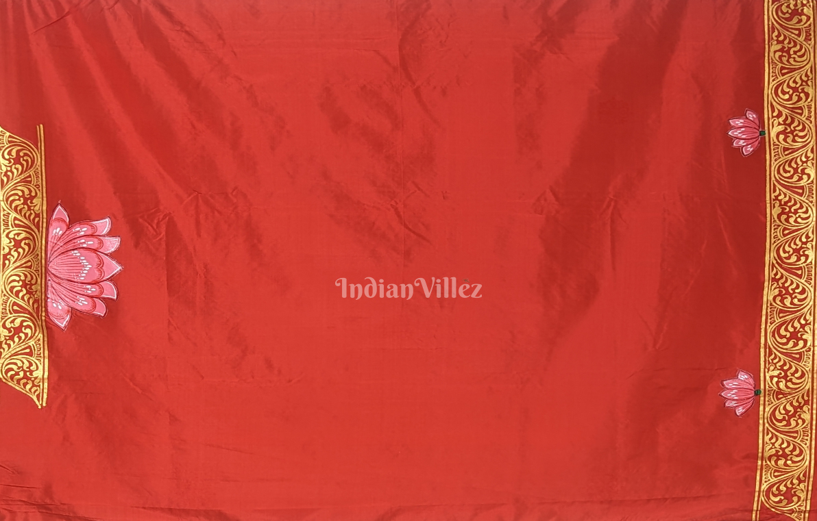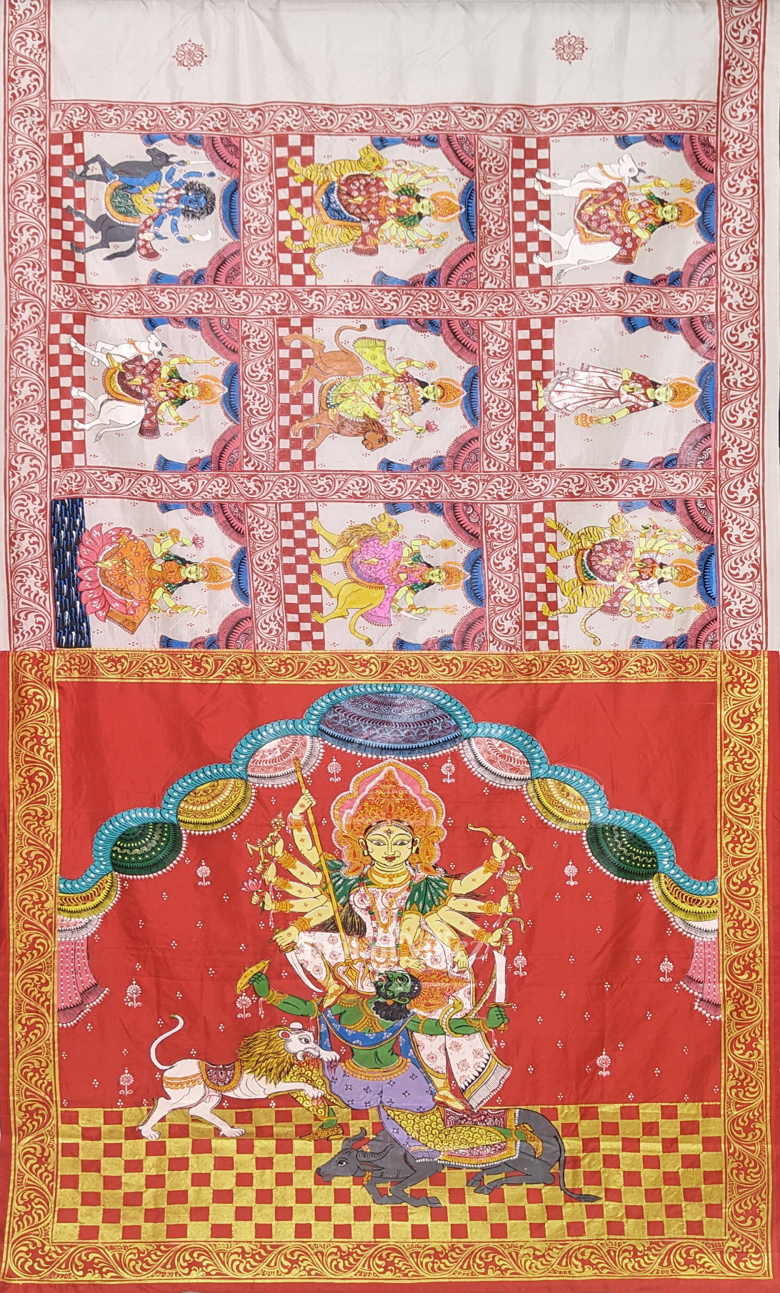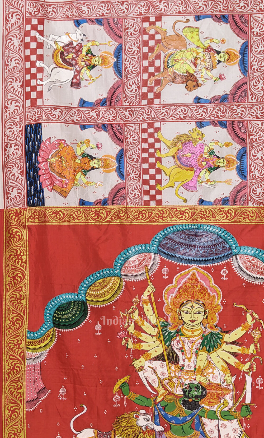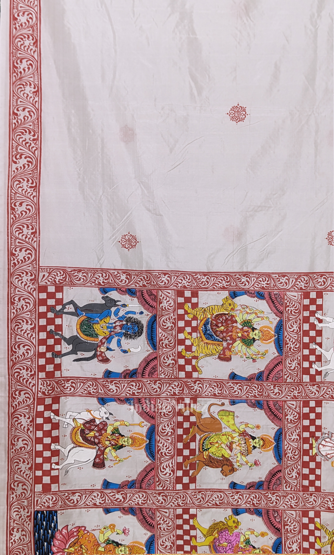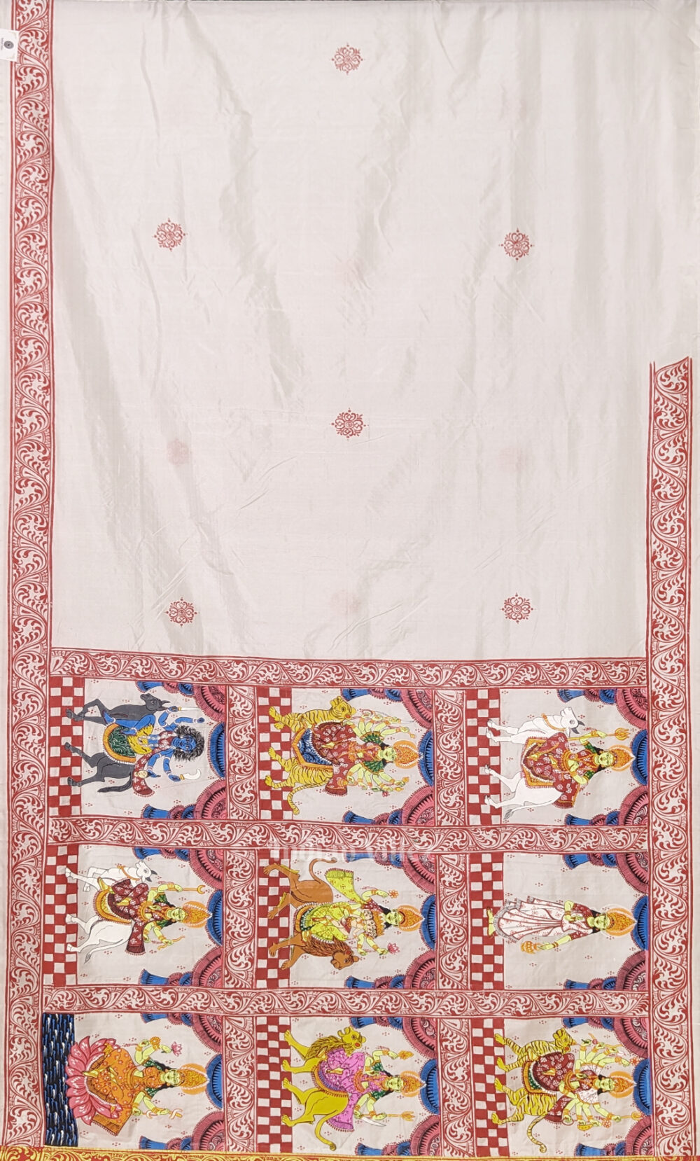 White Red Navaratri Durga Puja Theme Hand-Painted Pattachitra Saree-(Mulberry Silk)